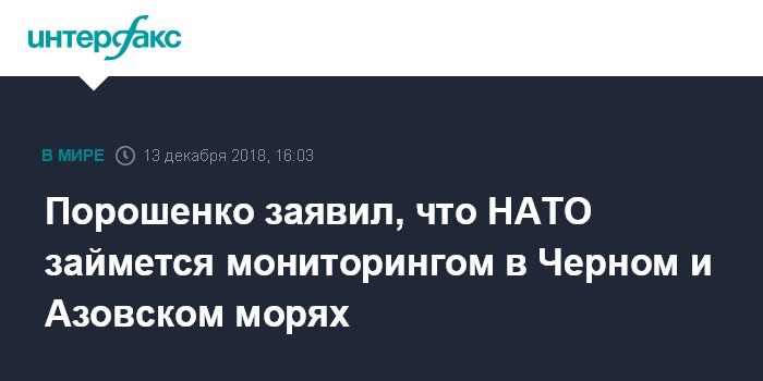 Москва. 13 декабря. INTERFAX.RU - Президент Украины Петр Порошенко заявил о достижении договоренности об организации Североатлантическим альянсом воздушного и морского мониторинга ситуации в Азово-Черноморском регионе.