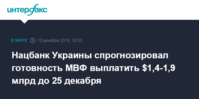 Нацбанк Украины спрогнозировал готовность МВФ выплатить $1,4-1,9 млрд до 25 декабря