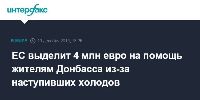 Москва. 13 декабря. INTERFAX.RU - Европейский Союз выделяет дополнительные 4 млн евро для оказания гуманитарной помощи жителям Донбасса в связи с наступлением зимы, сообщают в Европейской комиссии.
