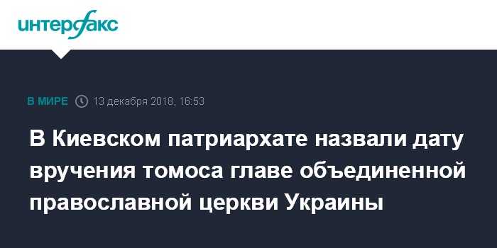 Москва. 13 декабря. INTERFAX.RU - Константинопольский патриарх Варфоломей передаст томос об автокефалии Украинской православной церкви лично избранному предстоятелю объединенной православной церкви на Украине 6 января 2019 года, сообщил глава информационного управления УПЦ Киевского патриархата архиепископ Евстратий (Зоря), сообщает "Би-Би-Си Украина".