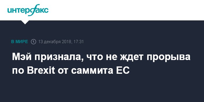 Москва. 13 декабря. INTERFAX.RU - Премьер-министр Великобритании Тереза Мэй не ожидает незамедлительного прорыва по Brexit по итогам двухдневной встречи лидеров ЕС, сообщает телеканал Sky News.