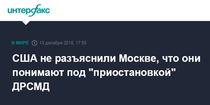 Москва. 13 декабря. INTERFAX.RU - США не предоставили России никаких разъяснений относительно так называемой "приостановки" выполнения своих обязательств по Договору о ликвидации ракет средней и меньшей дальности (ДРСМД), и непонятно, что Вашингтон вкладывает в это понятие, заявил замглавы МИД РФ Сергей Рябков.