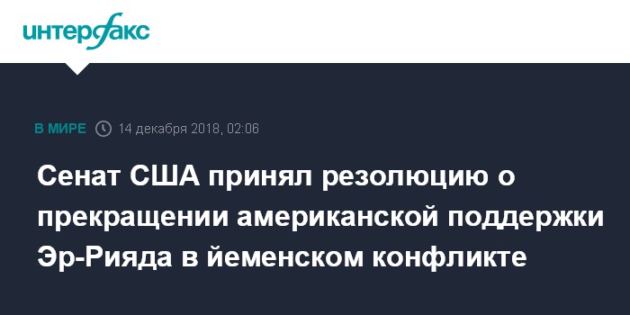 Москва. 14 декабря. INTERFAX.RU - Сенат США одобрил резолюцию о прекращении поддержки США Саудовской Аравии в военном конфликте в Йемене. Как следует из итогов голосования, за резолюцию выступило 56 сенаторов, 41 высказались против.