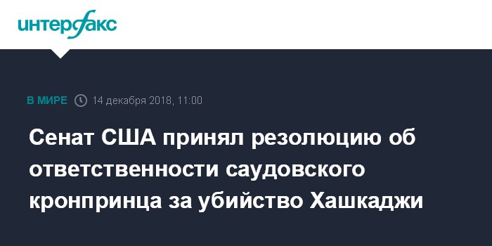Москва. 14 декабря. INTERFAX.RU - Сенат США одобрил резолюцию, в которой ответственность за убийство журналиста Джамаля Хашкаджи возлагается на наследного принца Саудовской Аравии Мохаммеда бен Салмана, сообщает в пятницу The Hill.