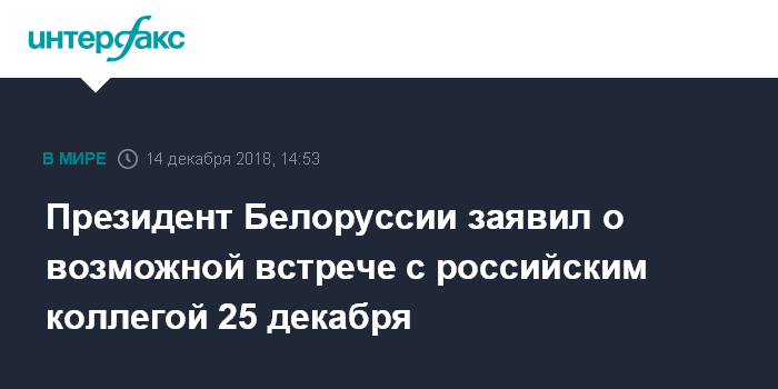 Москва. 14 декабря. INTERFAX.RU - Президент Белоруссии Александр Лукашенко предполагает, что его встреча с президентом России Владимиром Путиным может состояться 25 декабря в Москве.