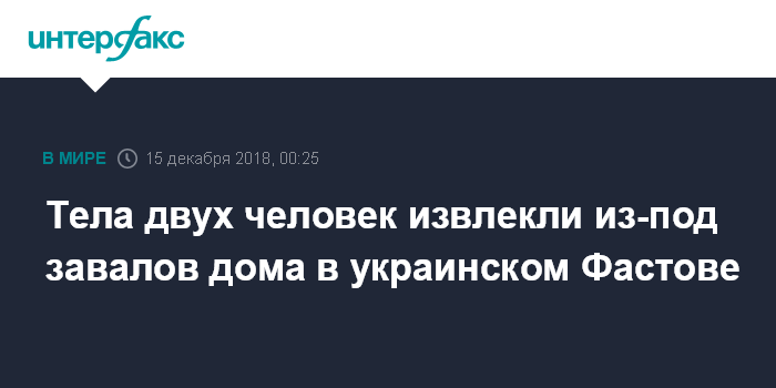 Москва. 15 декабря. INTERFAX.RU - Из-под завалов обрушившейся многоэтажки в городе Фастов были извлечены два тела, сообщил глава Государственной службы по чрезвычайным ситуациям (ГСЧС) Николай Чечеткин.