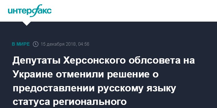 Москва. 15 декабря. INTERFAX.RU - Депутаты Херсонского областного совета отменили решение о предоставлении русскому языку статуса регионального на территории Херсонской области, сообщает Херсонская областная государственная администрация.