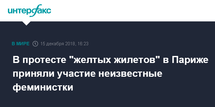 Москва. 15 декабря. INTERFAX.RU - Пять женщин, загримированных под деву Марианну - один из символов Франции - в рамках акции протеста "желтых жилетов" в Париже - молча вышли в субботу к полицейским на Елисейских полях, сообщает французский телеканал BFM TV.