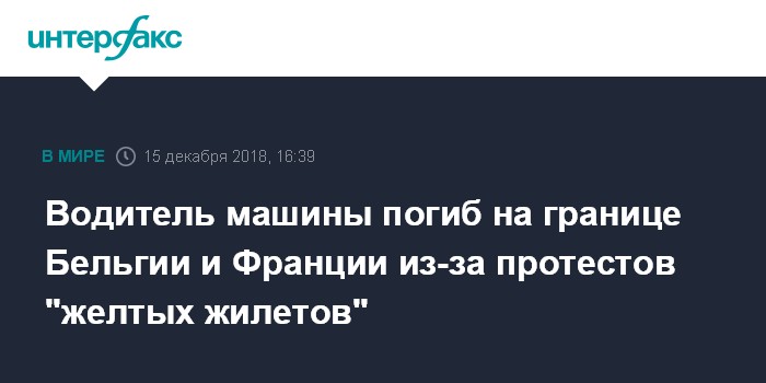 Москва. 15 декабря. INTERFAX.RU - Авария в Бельгии, в результате которой в ночь на субботу погиб водитель автомобиля, было связано с протестами "желтых жилетов", сообщили журналистам представители французских властей.
