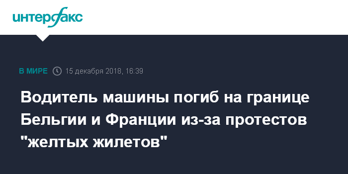 Столкновение с летальным исходом произошло на границе Бельгии и Франции после того, как грузовик притормозил перед "желтыми жилетами", заблокировавшими дорогу на французской территории. В грузовик сзади врезался другой автомобиль, водитель которого погиб.