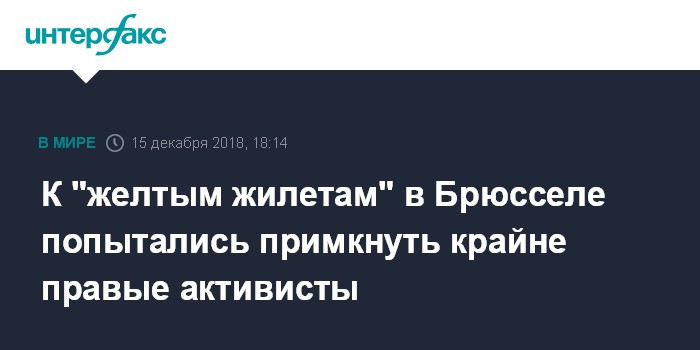 Москва. 15 декабря. INTERFAX.RU - Члены бельгийского крайне-правого националистического движения "Насьон" присоединились к немногочисленной манифестации "желтых жилетов", проходившей в субботу в Брюсселе, сообщают СМИ Бельгии.