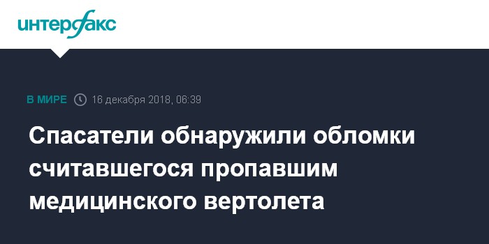 Спасатели обнаружили обломки считавшегося пропавшим медицинского вертолета