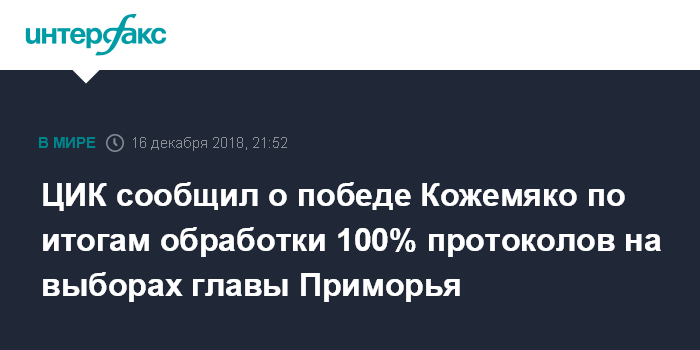 Москва. 16 декабря. INTERFAX.RU - Врио главы Приморского края Олег Кожемяко по итогам обработки всех протоколов участковых комиссий побеждает в повторных губернаторских выборах, набрав 61,88% голосов избирателей.