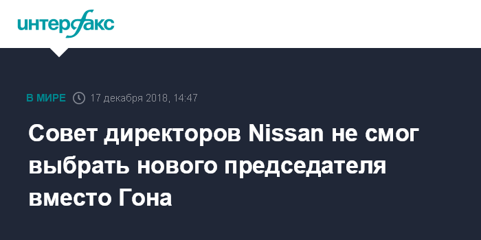 Москва. 17 декабря. INTERFAX.RU - Совет директоров Nissan Motor Co. так и не смог выбрать нового председателя на смену занимавшему этот пост Карлосу Гону, который был арестован 19 ноября и вскоре после этого уволен компанией.