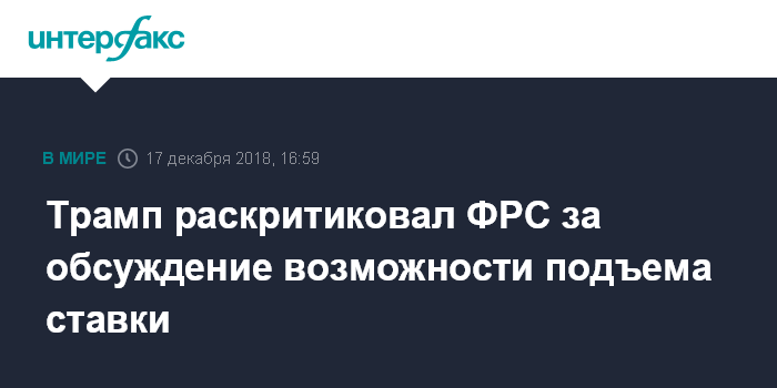 Москва. 17 декабря. INTERFAX.RU - Президент США Дональд Трамп раскритиковал Федеральную резервную систему (ФРС), которая во вторник начинает очередное двухдневное заседание, за то, что она вообще рассматривает возможность повышения ставки.