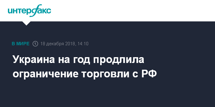 Москва. 18 декабря. INTERFAX.RU - Кабинет министров Украины на заседании во вторник продлил до 31 декабря 2019 года включительно действие эмбарго на ряд товаров из РФ и ввозной пошлины в отношении других российских товаров, введенные в 2016 году в ответ на торговые запреты и ограничения РФ в отношении Украины.