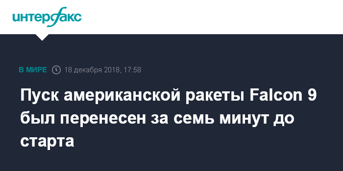 Москва. 18 декабря. INTERFAX.RU - По техническим причинам запуск ракеты-носителя Falcon 9 со спутником системы глобального позиционирования третьего поколения GPS III ВВС США, планировавшийся во вторник с космодрома на мысе Канаверал, отменен за семь минут до старта, сообщила компания-разработчик ракеты SpaceX.