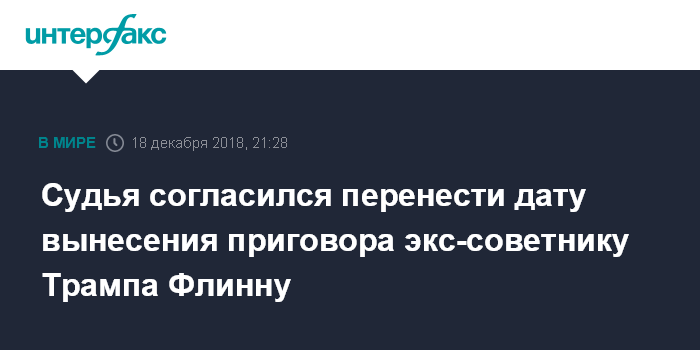 Москва. 18 декабря. INTERFAX.RU - Федеральный судья, рассматривающий дело экс-советника президента США Майкла Флинна, согласился перенести дату вынесения приговора по его делу, сообщает во вторник агентство Bloomberg.