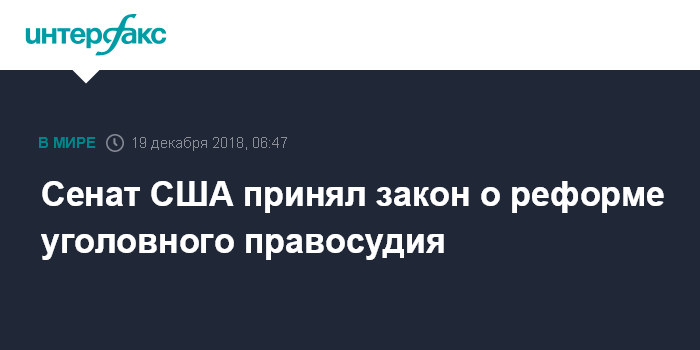 Москва. 19 декабря. INTERFAX.RU - Сенат США одобрил законопроект о реформе уголовного правосудия, за который выступал президент Дональд Трамп.