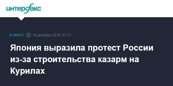 Москва. 19 декабря. INTERFAX.RU - Япония выразила протест России после того, как стало известно о построенных казармах для российских военных на курильских островах Итуруп и Кунашир.