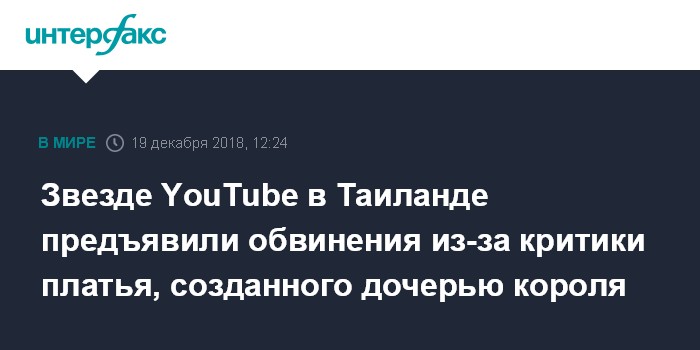 Москва. 19 декабря. INTERFAX.RU - Судебные власти Таиланда предъявили обвинения популярной в стране ведущей канала в YouTube Ванчалеоме Йамнепнпхол после того, как она подвергла критике платье, созданное по дизайну дочери короля Махи Вачиралонгкорна, сообщает в среду газета The Guardian.