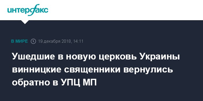 "После того, как митрополит Винницкий и Барский Симеон объявил о переходе в созданную Константинополем церковь, 75 из 250 священников епархии, по словам теперь уже бывшего ее руководителя, последовали за ним. Однако во вторник в Крестовоздвиженском соборе Винницы прошла встреча духовенства епархии с новоназначенным архиереем - архиепископом Варсонофием, после которого 45 "ушедших" клириков заявили, что останутся в канонической Церкви", - рассказал собеседник агентства.