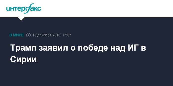 Москва. 19 декабря. INTERFAX.RU - Президент США Дональд Трамп заявил, что США разгромили силы группировки "Исламское государство" (ИГ - террористическая группировка, запрещена в РФ) в Сирии и что американские военные находятся в Сирии только ради этой цели.