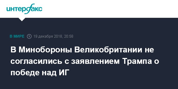Москва. 19 декабря. INTERFAX.RU - Заместитель министра обороны Великобритании Тобиас Эллвуд в среду выразил несогласие с заявлением президента США Дональда Трампа о полной победе над террористической группировкой "Исламское государство" (ИГ, запрещена в РФ) в Сирии.