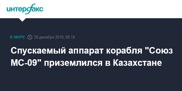 Москва. 20 декабря. INTERFAX.RU - Спускаемый аппарат транспортного пилотируемого корабля "Союз МС-09", в бытовом отсеке которого в августе было обнаружено просверленное отверстие, с российским космонавтом Сергеем Прокопьевым, астронавтами NASA Сериной Ауньон-Чэнселлор и ЕКА Александром Герстом, в 8:02 gj по Москве успешно приземлился в Казахстане, передает корреспондент "Интерфакса" из Центра управления полетами.