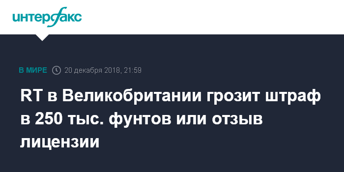 Москва. 20 декабря. INTERFAX.RU - Британский медиарегулятор Ofcom, ранее объявивший, что увидел в действиях телеканала RT нарушения правил беспристрастности, может применить против RT ряд мер, включая штраф в размере 250 тысяч фунтов стерлингов (21,3 млн рублей) или отзыв лицензии.