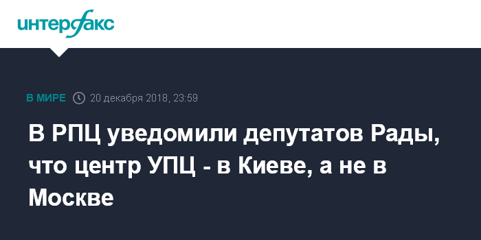 Москва. 20 декабря. INTERFAX.RU - В Русской православной церкви указали депутатам украинского парламента на то, что центр УПЦ находится не в Москве, а в Киеве.
