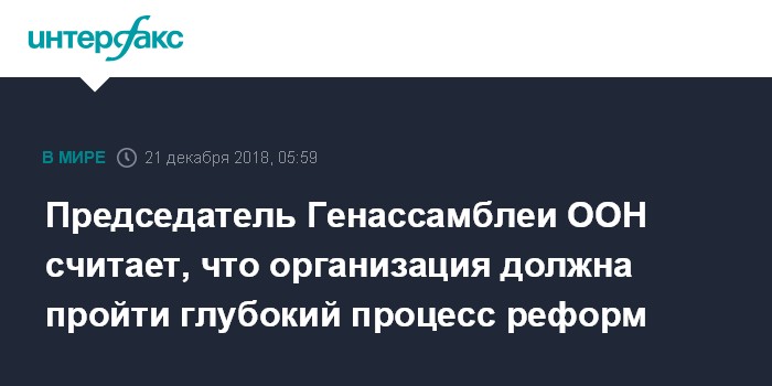 Москва. 21 декабря. INTERFAX.RU - ООН должна адаптироваться к новым вызовам и новому геополитическому ландшафту, вследствие этого организации необходимо пройти глубокий процесс реформ, заявила председатель Генеральной Ассамблеи ООН Мария Фернанда Эспиноса Гарсес в интервью, опубликованном в пятницу в газете "Известия".