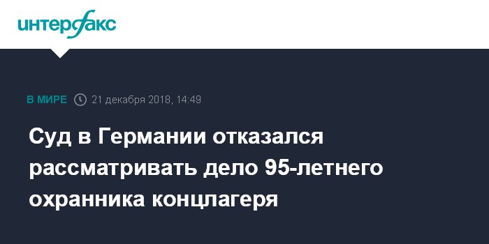 Москва. 21 декабря. INTERFAX.RU - Суд в Германии отказался начать судебный процесс по делу 95-летнего мужчины, который, предположительно, работал охранником концлагеря Маутхаузен в Австрии, сообщает в пятницу агентство Associated Press.