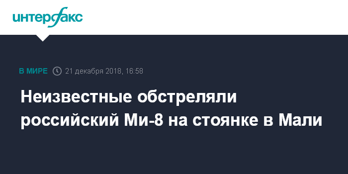 Москва. 21 декабря. INTERFAX.RU - Неизвестные обстреляли российский вертолет Ми-8 в Мали, сообщил "Интерфаксу" источник, знакомый с ситуацией.