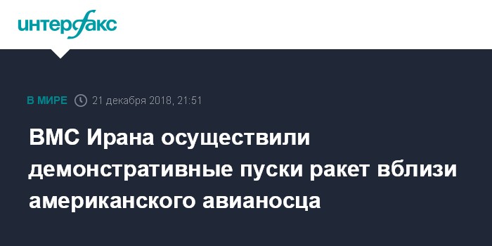 Москва. 21 декабря. INTERFAX.RU - Корабли ВМС Ирана произвели пуски ракет вблизи авианосной ударной группы ВМС США, которая в пятницу входила в акваторию Персидского залива, сообщили американские журналисты, находящиеся на борту атомного авианосца "Джон Стеннис".