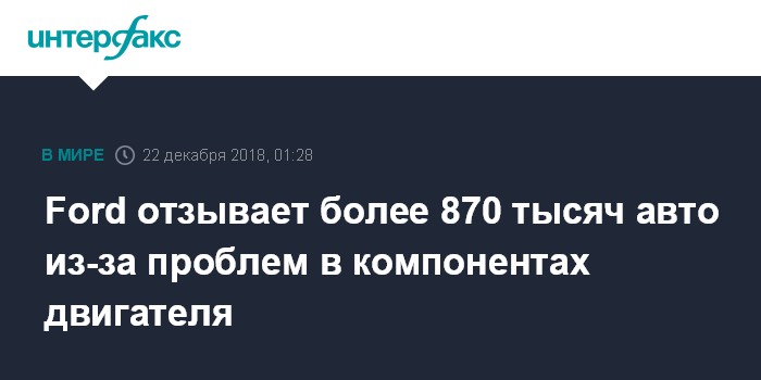 Москва. 22 декабря. INTERFAX.RU - Американский производитель автомобилей Ford Motor отзывает более 870 тысяч пикапов в Северной Америке из-за неисправностей с блоком цилиндров в двигателе, передает в пятницу телеканал CBS News.