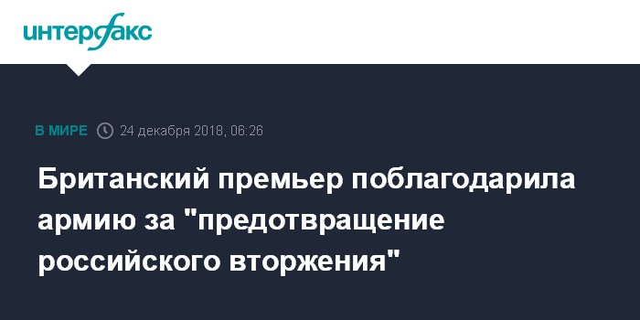 Москва. 24 декабря. INTERFAX.RU - Премьер-министр Великобритании Тереза Мэй выразила благодарность британским военнослужащим за то, что они своими действиями предотвратили "вторжение России в территориальные воды и воздушное пространство страны", а также сыграли важную роль в деле очистки Солсбери от "Новичка".