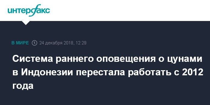 Москва. 24 декабря. INTERFAX.RU - В индонезийском Агентстве по противодействию природным катаклизмам заявили, что стране необходимо разработать новую систему раннего оповещения о цунами, так как система из сети буев не действует с 2012 года, пишет в понедельник британская газета The Guardian.