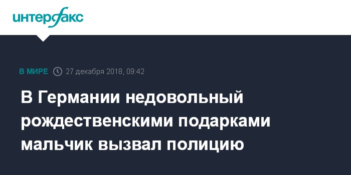 Москва. 27 декабря. INTERFAX.RU - Девятилетний мальчик в Германии вызвал полицию из-за того, что был крайне недоволен своими рождественскими подарками, сообщает в среду Spiegel.