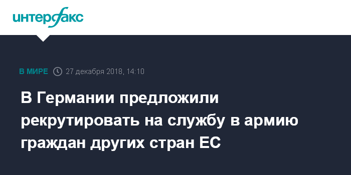 Москва. 27 декабря. INTERFAX.RU - Власти Германии изучают возможность привлекать граждан других стран Евросоюза для прохождения службы в немецкой армии, сообщил в четверг генеральный инспектор бундесвера Эберхард Цорн.