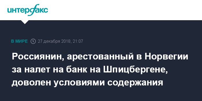 Ранее СМИ сообщили со ссылкой на сайт губернатора архипелага Шпицбергена, что утром 21 декабря 29-летний гражданин России с винтовкой проник в здание банка Sparebank 1 в Лонгиербюене и похитил 70 тыс. норвежских крон. В тот же день подозреваемый был задержан и доставлен в норвежский город Тромсё.
