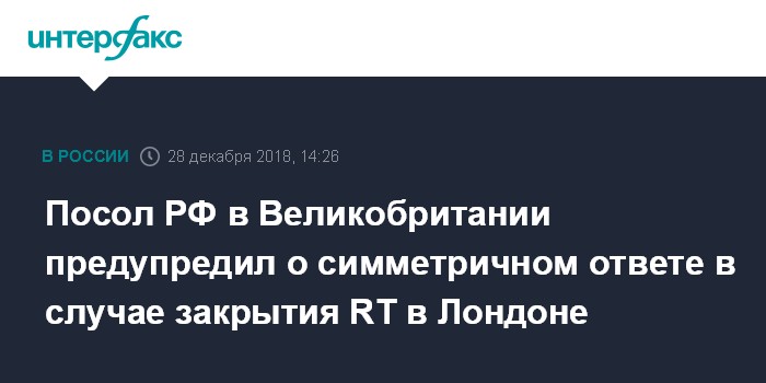 Москва. 28 декабря. INTERFAX.RU - В случае закрытия британскими властями телеканала RT в Лондоне зеркальные меры будут приняты в отношении BBC в России, заявил посол РФ в Великобритании Александр Яковенко.