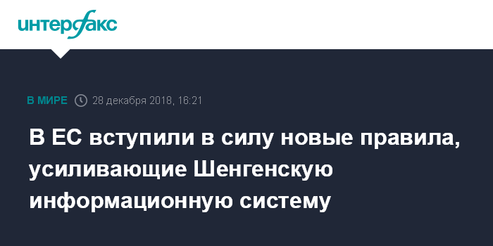 Москва. 28 декабря. INTERFAX.RU - Европейская комиссия объявила в пятницу о вступлении в силу предложенных ею в декабре 2016 года новых правил, призванных усилить Шенгенскую информационную систему (SIS) в рамках строительства союза безопасности ЕС.