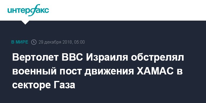 Москва. 29 декабря. INTERFAX.RU - Вертолет израильских ВВС нанес удар по посту движения ХАМАС в секторе Газа в ответ на ракетный пуск по территории Израиля, сообщила пресс-служба израильской армии.