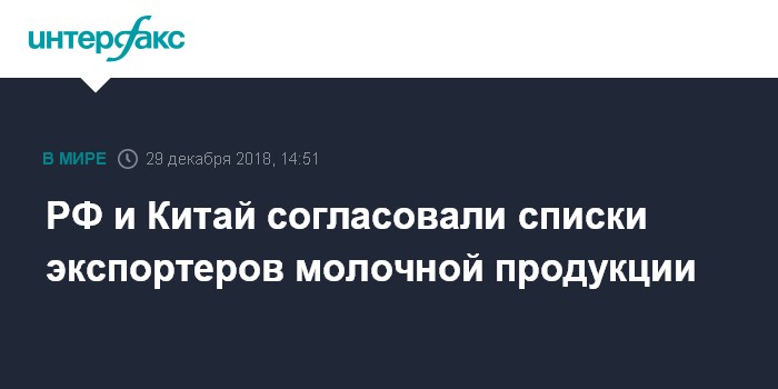 На официальном сайте Главного таможенного управления КНР размещены списки 10 российских производителей молочной продукции, имеющих право поставок в Китай. На сайте также опубликован образец ветеринарного сертификата на молоко и молочные продукты, предназначенные для экспорта из России в КНР.