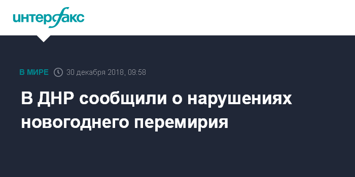Москва. 30 декабря. INTERFAX.RU - В первые сутки "новогоднего перемирия" Вооруженные силы Украины нарушили его четыре раза, сообщил журналистам представитель самопровозглашенной Донецкой народной республики (ДНР) в Совместном центре по контролю и координации за режимом прекращения огня.