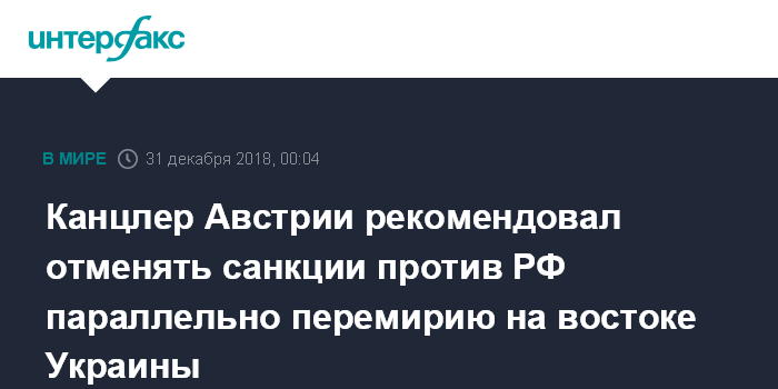 Москва. 30 декабря. INTERFAX.RU - Канцлер Австрии Себастьян Курц в интервью газете Rheinische Post напомнил, что поэтапное снятие с России санкций должно быть привязано к процессу урегулирования ситуации на востоке Украины.