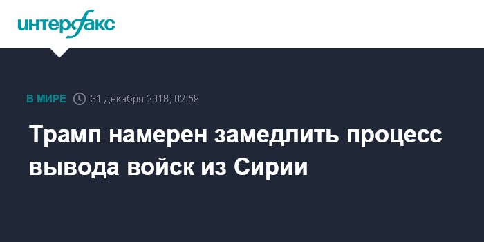 Москва. 31 декабря. INTERFAX.RU - Президент США Дональд Трамп распорядился замедлить вывод войск из Сирии, сообщил журналистам сенатор-республиканец Линдси Грэм.