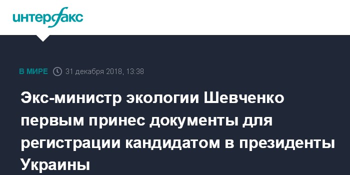 Москва. 31 декабря. INTERFAX.RU - Бывший министр экологии и природных ресурсов Украины Игорь Шевченко, занимавший эту должность в 2014-2015 годах, первым сдал документы в Центральную избирательную комиссию для регистрации кандидатом на очередных выборах президента Украины 31 марта 2019 года.