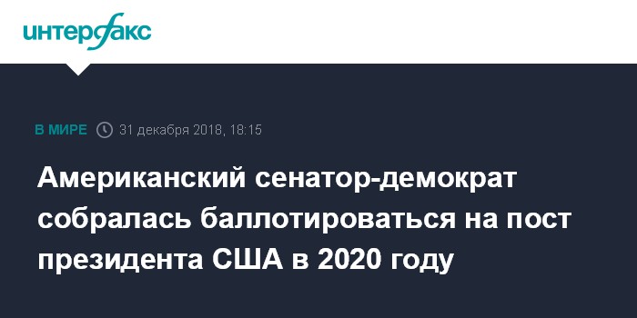 Москва. 31 декабря. INTERFAX.RU - Сенатор от Демократической партии США Элизабет Уоррен объявила, что собирается баллотироваться на президентский пост на выборах 2020 года.